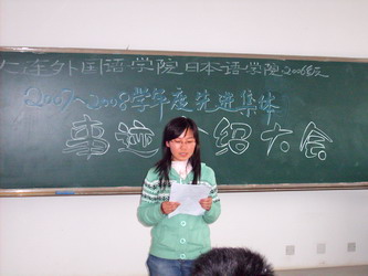 本次大会旨在评选出2007—2008学年度日本语学院06级先进班集体,与以往单纯地上交材料地评选方式不同,这次评选各竞选班级的班长利用多媒体形式,将班级建设成果及竞选优势声情并茂地展现在众人面前。