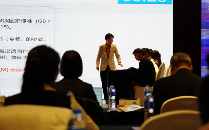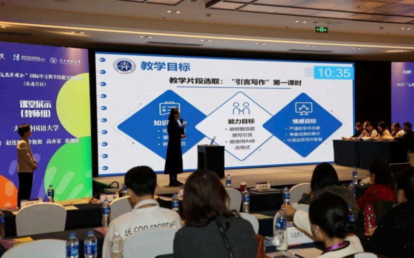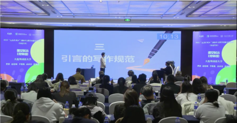 在全程直播的线下课堂展示环节,安晓燕副院长介绍整体思路,赵连城老师具体讲授合理合规地使用AI修改引言格式的方法,共同展示了从容自信、亲切自然的大外汉学院教师风采。教师团队的教学理念和方法受到来自北京和广东的评审专家高度认可。