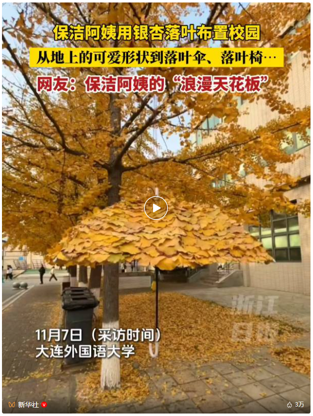 央视一套:银杏叶解锁秋冬限定浪漫,好暖心大连外国语保洁阿姨化身大地艺术家