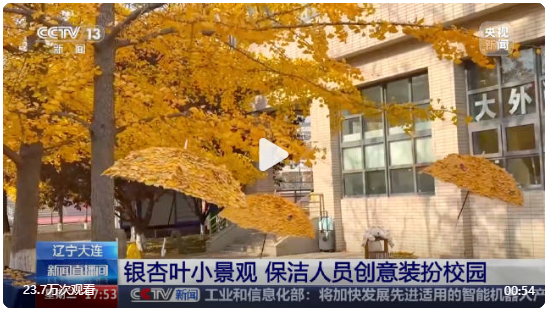 近日,在辽宁大连外国语大学,保洁阿姨们利用工作间隙,将打扫收集的落叶进行拼接、组装,反复调整。随后,金黄色的银杏叶被铺成金色地毯、被装饰成灿烂灵动的银杏伞,还有文艺别致的银杏桌椅,成为学生们的校园打卡点。保洁阿姨们表示,虽然这些景观可能过两天就会被风吹散,或者被新叶子盖住,但自己摆的不是永久作品,是希望借此带给大家一份秋冬的快乐,给校园添上多样的色彩。